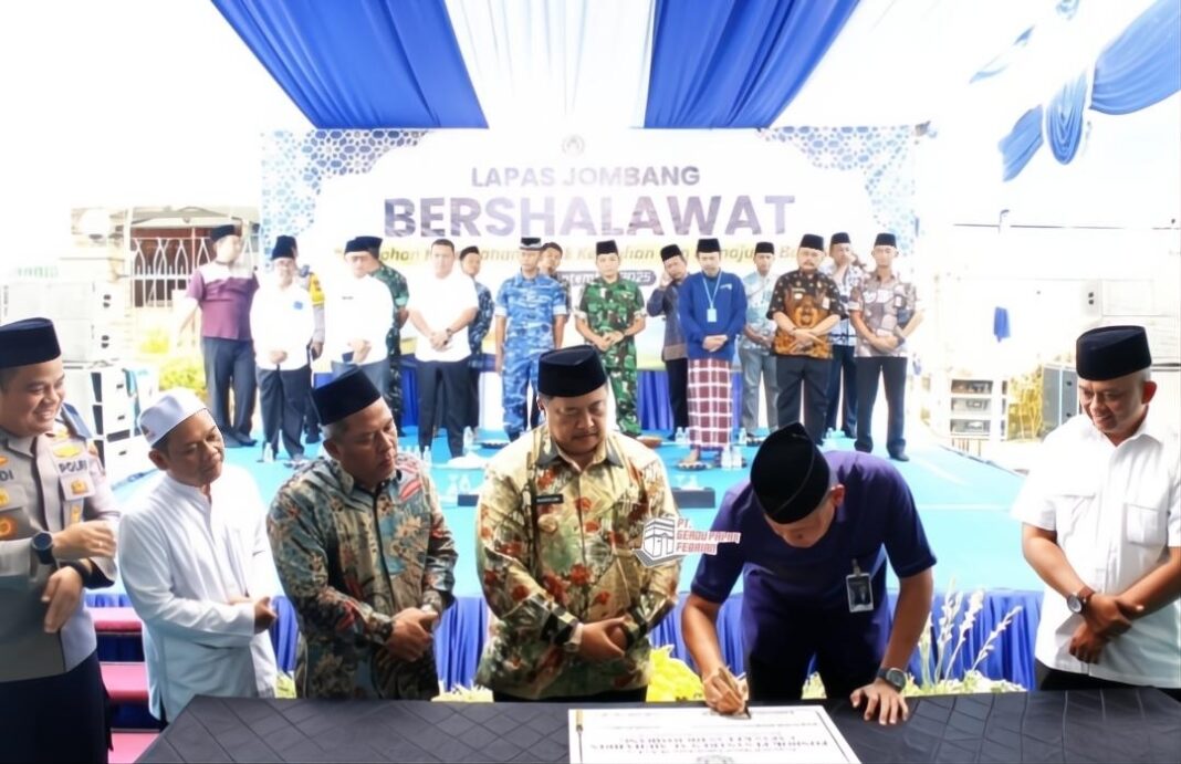 Jombang, Gerdupapak.com – Lembaga Permasyarakatan Kelas IlB Jombang gelar sholawatan bersama peringatan Maulid Nabi Muhammad SAW 1447 H serta meresmikan Pondok Pesantren Al-Muhajirin. Peresmian Pondok Pesantren Al-Muhajirin di tandai dengan penandatanganan prasasti oleh Kakanwil Ditjenpas Jatim Kadiyono serta Bupati Jombang Warsubi.
